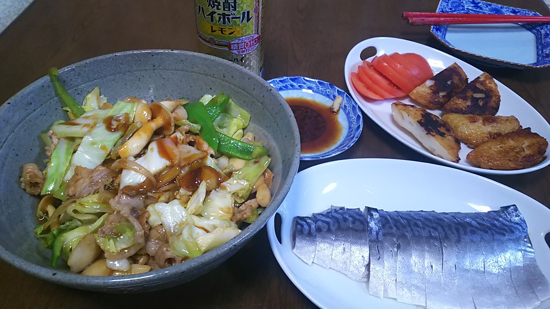 晩ご飯は、回鍋肉とできあいの練り物の焼き物と〆サバ。