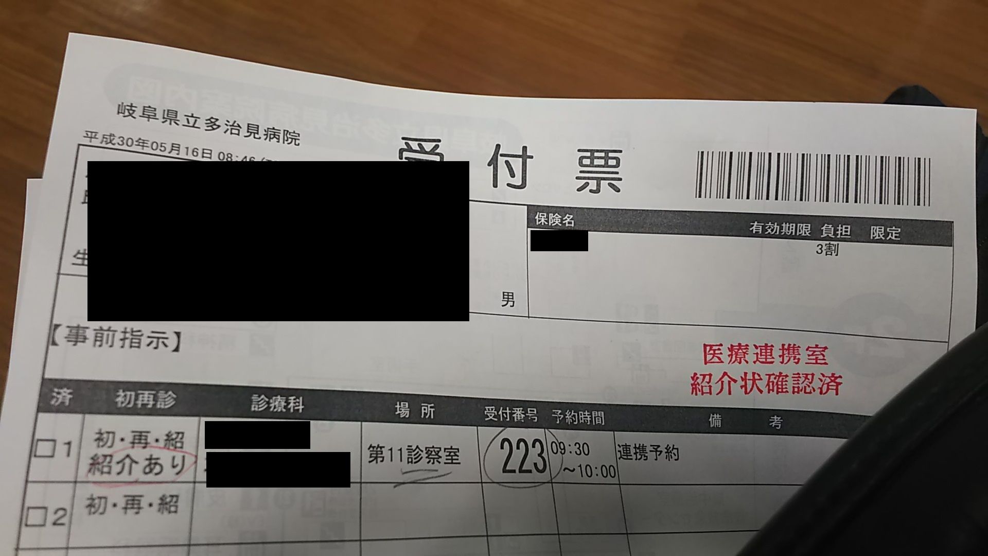 県病院に軽症の患者などが集まりすぎないように、基本的には町医者からの紹介状が必要な仕組みになっています。右側に赤いスタンプで「紹介状確認済」と押してあります。