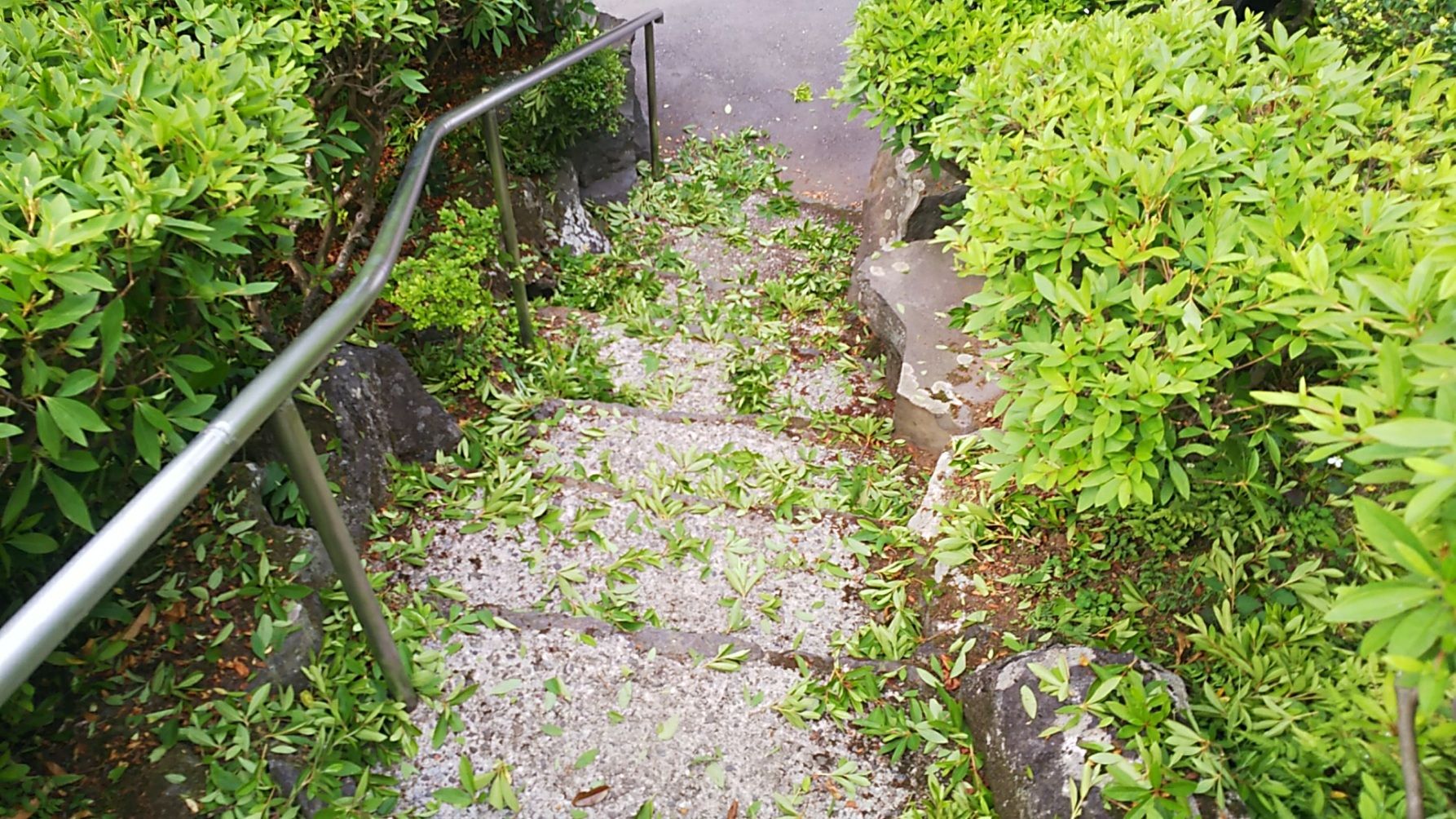 階段の手すりにはみ出しているさつき(つつじか?)の剪定。