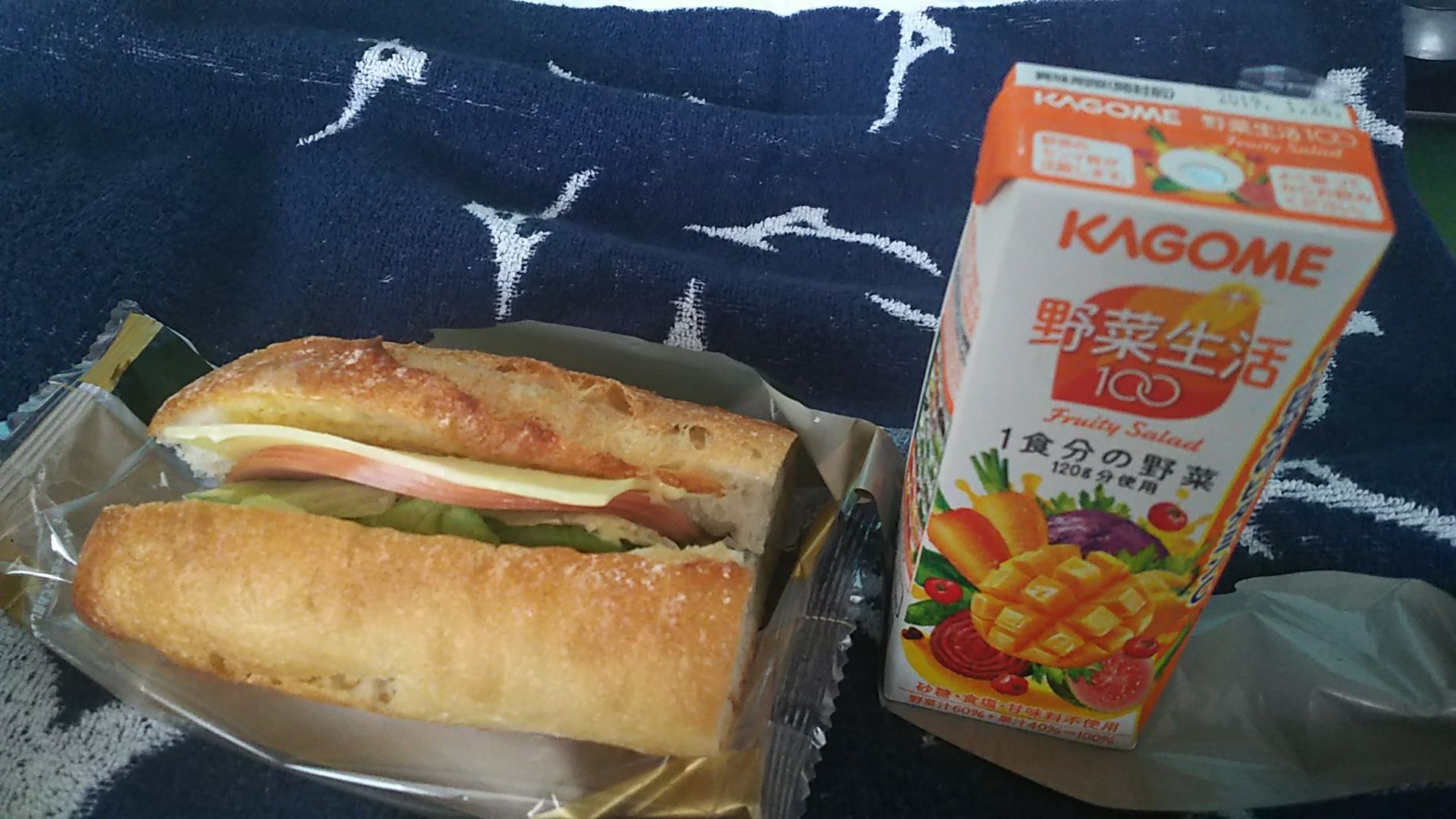 ところが外出予定がなくなったので、コンビニで買ってきたサンドイッチに野菜ジュース。