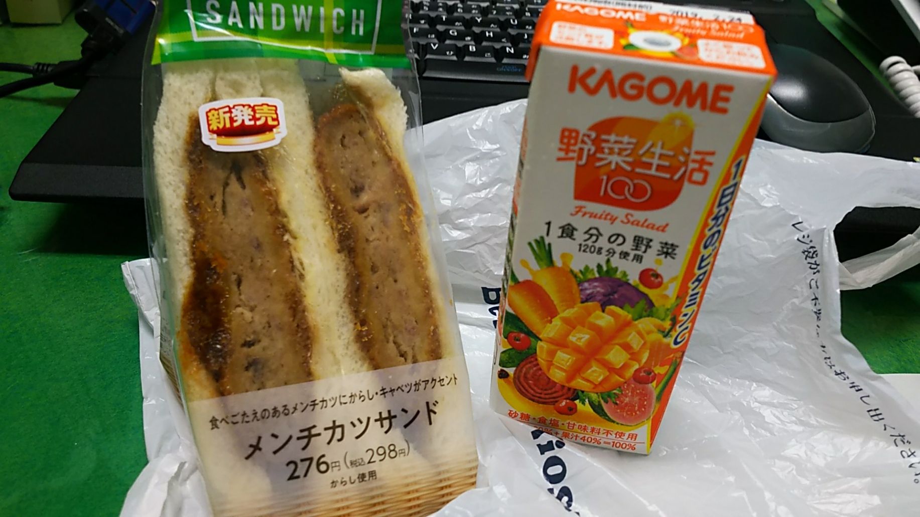 途中でコンビニの夜食。夜もサンドイッチ。タンパク質をとらないと、ということでメンチカツサンド。