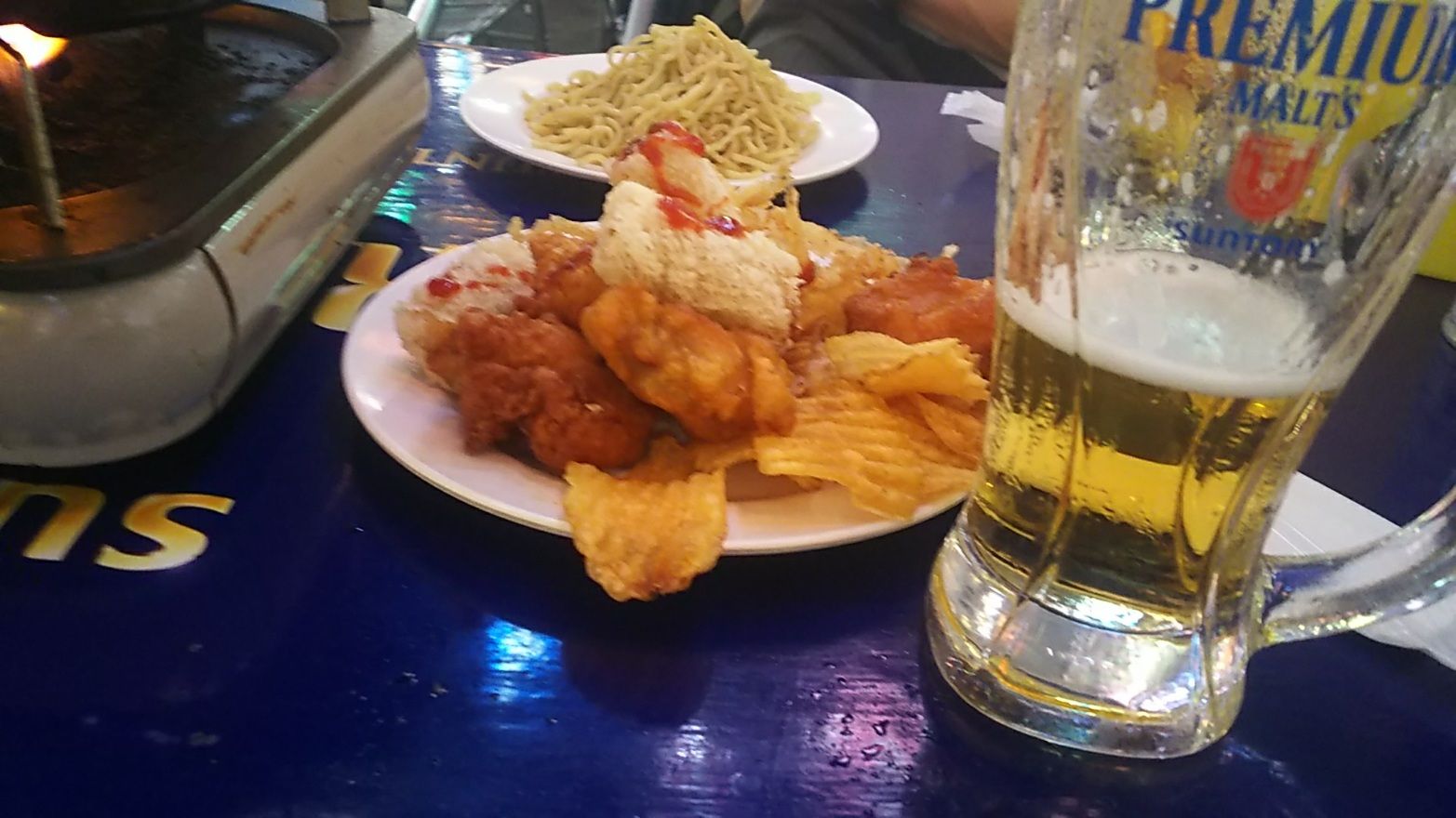 唐揚げなど定番のアテで、まずは一杯。