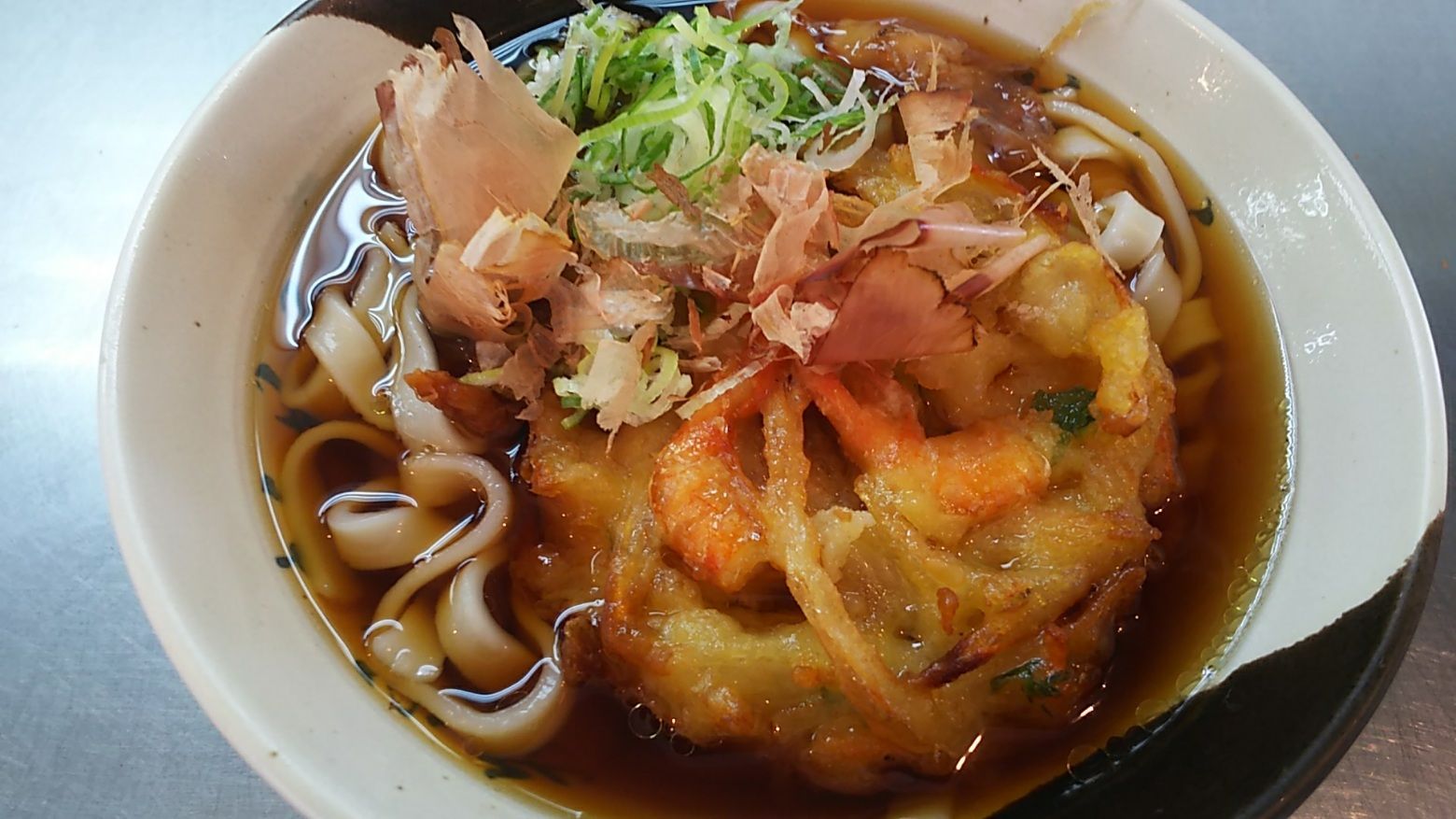 途中、千種駅のホームにある立ち食いで、かき揚げきしめんの朝食です。