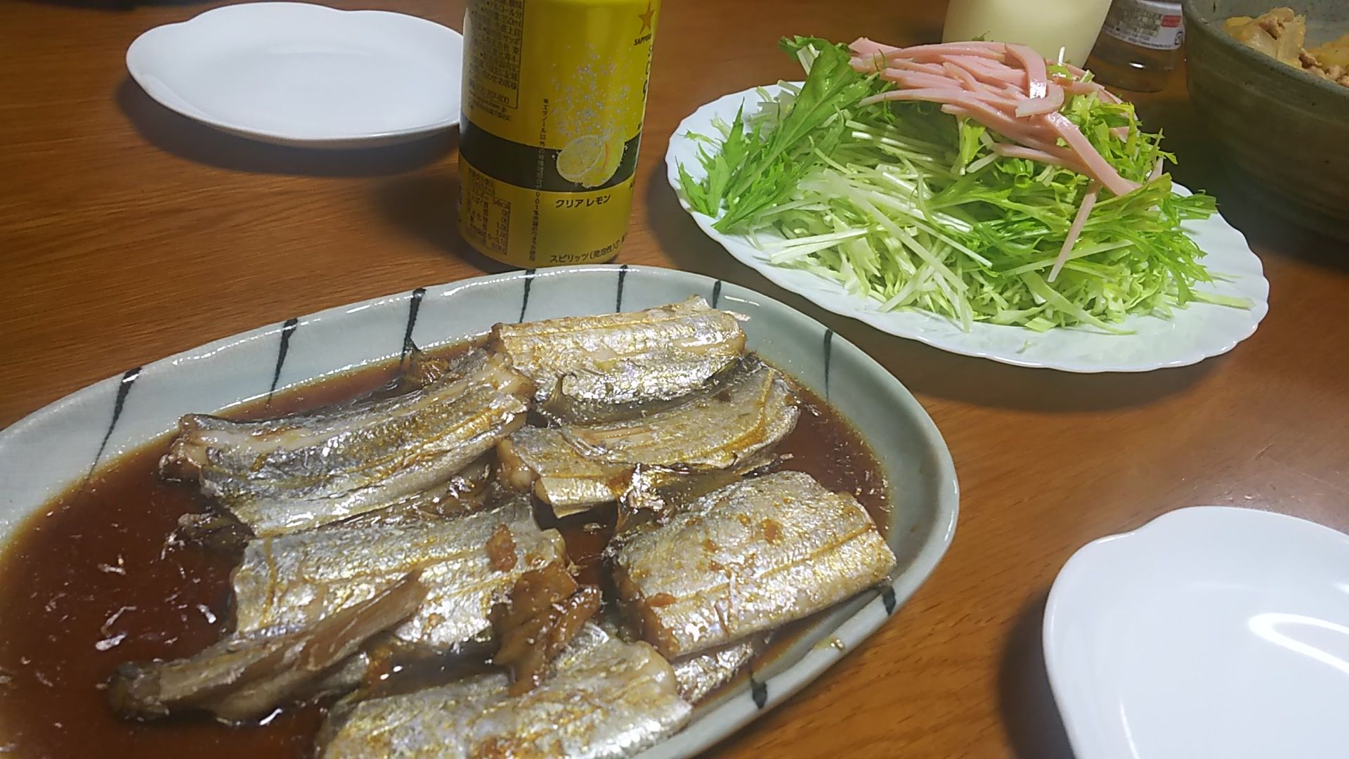 晩ご飯は、隣家のオヤジ会メンバーが釣ってきた太刀魚の煮つけ。