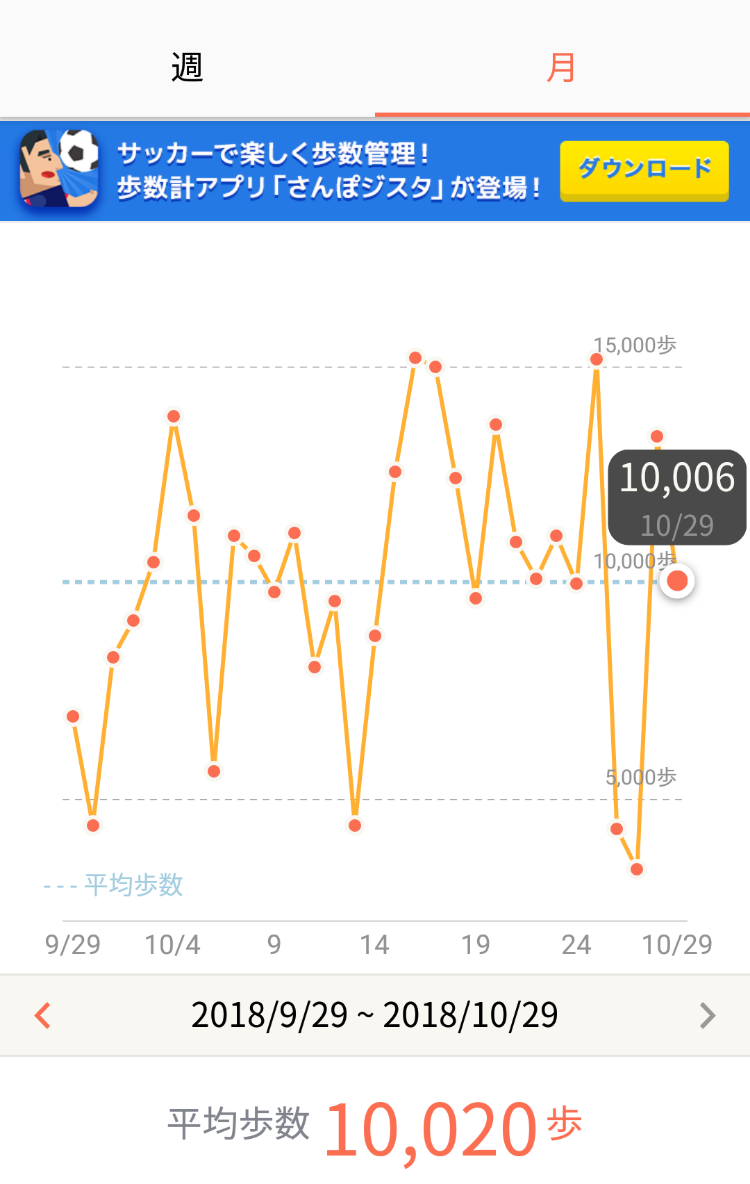 今日、かろうじて10,006歩歩いたので、過去1か月の平均が1万歩をきーぷしてます。