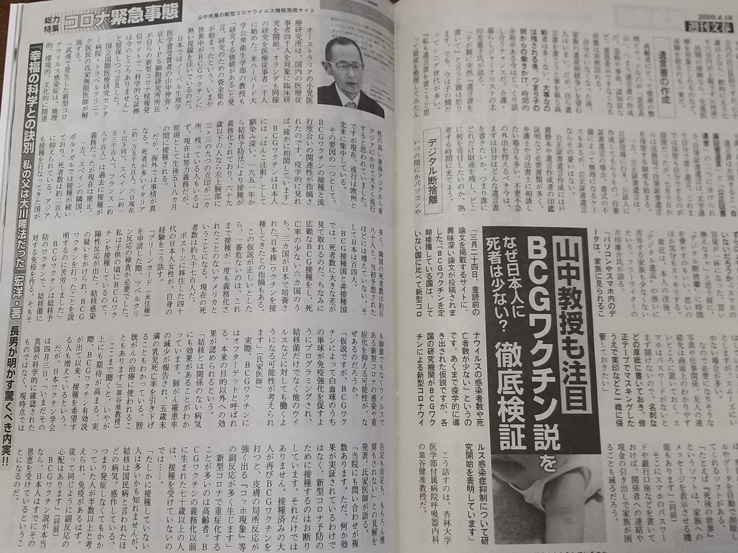 日本が欧米に比べて死者が一桁少ないのは、BCG接種が義務化されていたから、ではないか、という説。