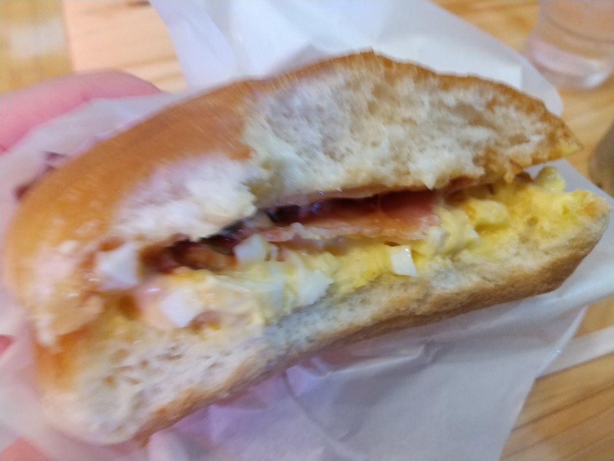 エッグは、スクランブルエッグと思いましたが、刻んだ茹で卵をたっぷりマヨネーズで混ぜた、いわゆる玉子サンドの中に入っているものでした。