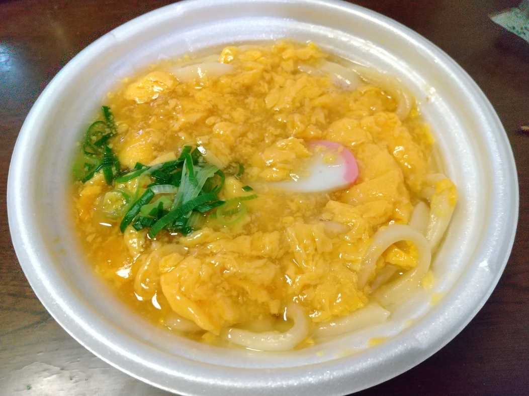 朝ごはんは、帰り道にコンビニで買ってきた玉子とじうどん。