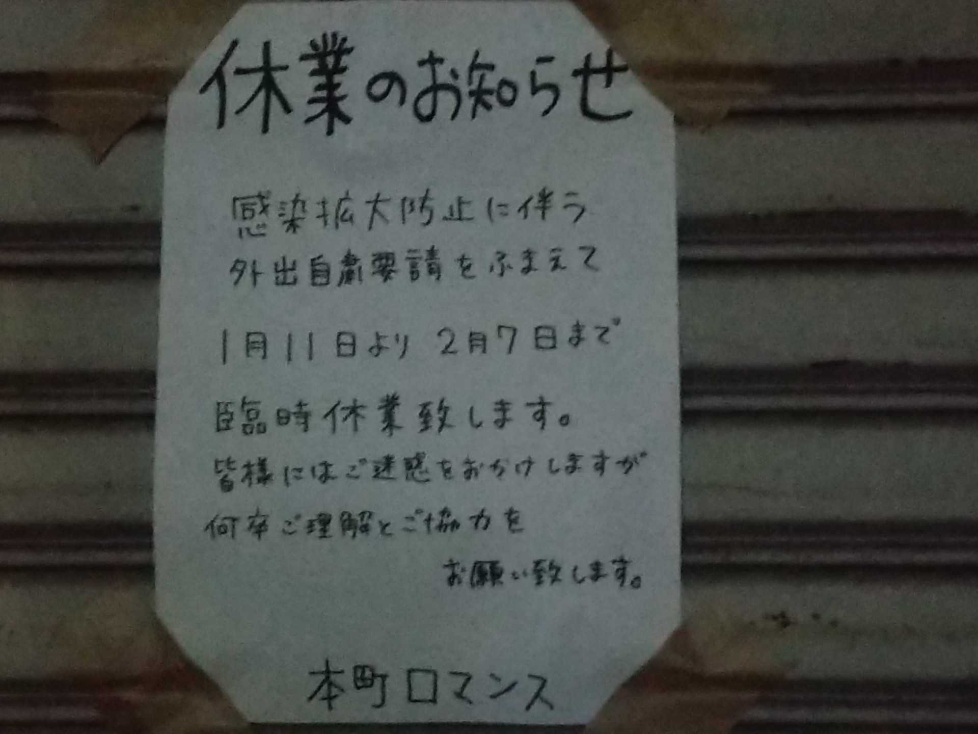 シャッターに張り紙。緊急事態宣言を受けての営業時間短縮のお知らせかな?と思ったら、違いました。