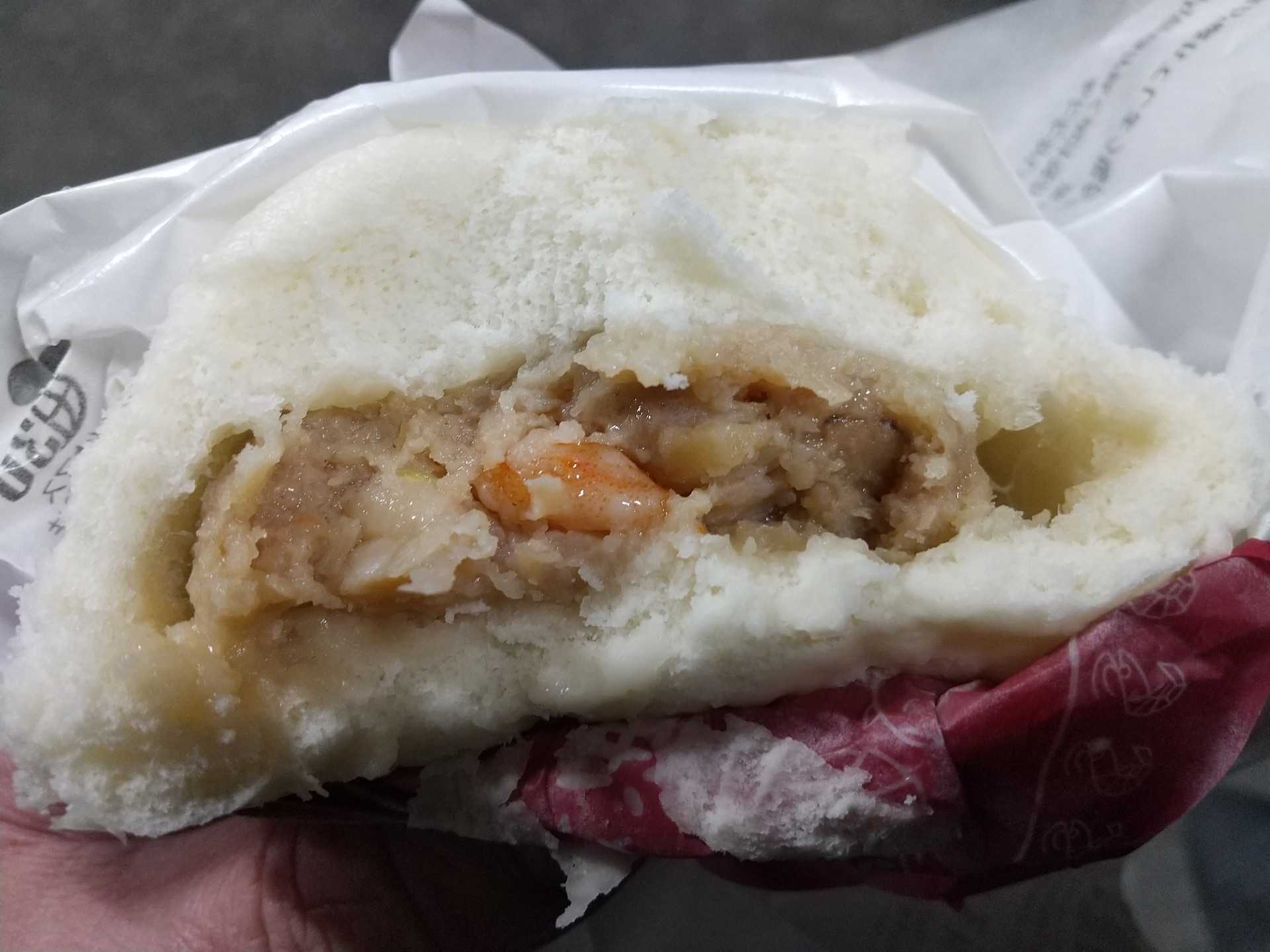 ファミマの新製品のエビ入り肉まんです。小ぶりのエビがゴロゴロ入っていて、美味しいです。