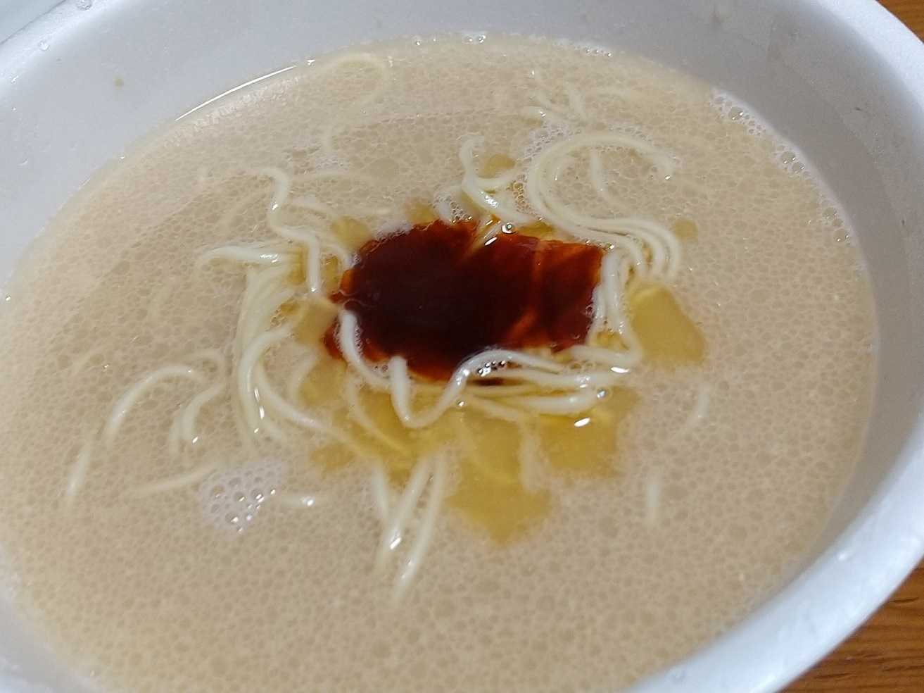 スープは、豚骨スープ。濃厚で、カップ麺のジャンルでは、美味しい部類になると思います。