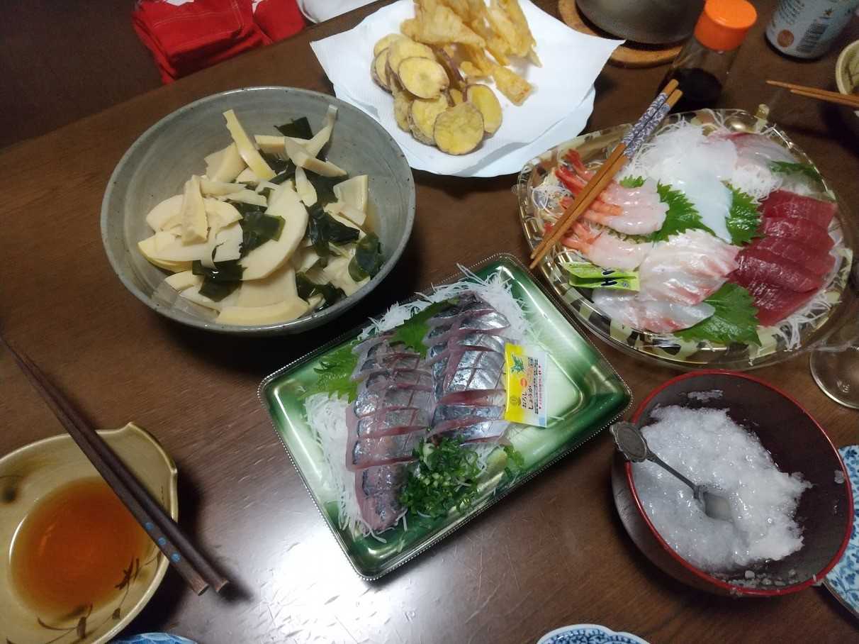 若竹煮とタケノコの天ぷら。それにお刺身です。
