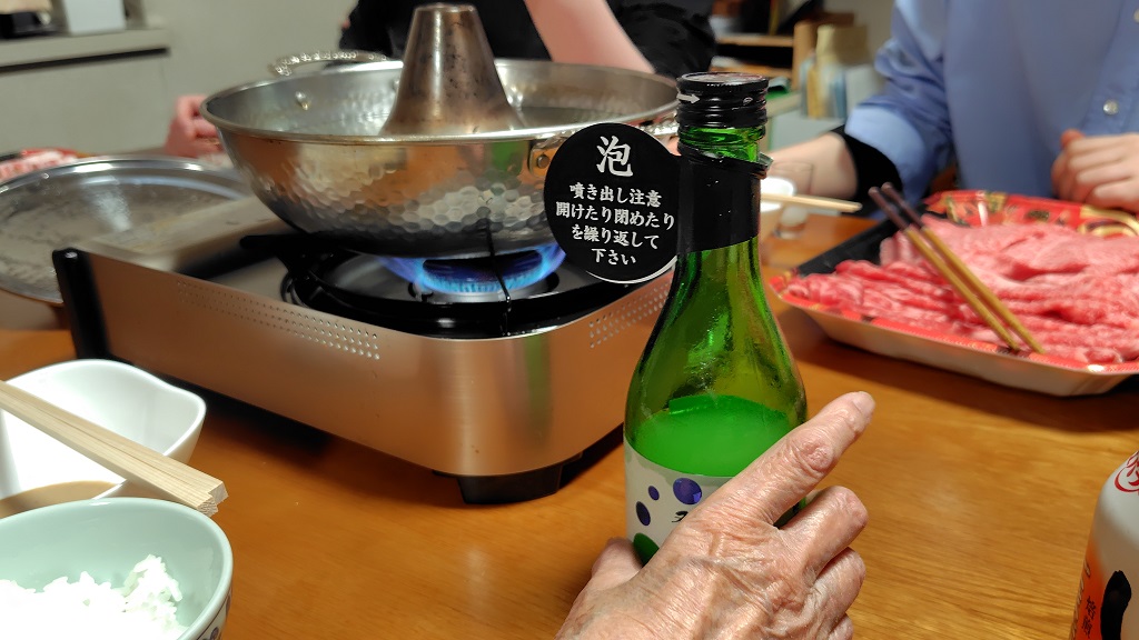 ばあちゃんが手にしているのは、三千盛。発泡性のあるうすにごりです。