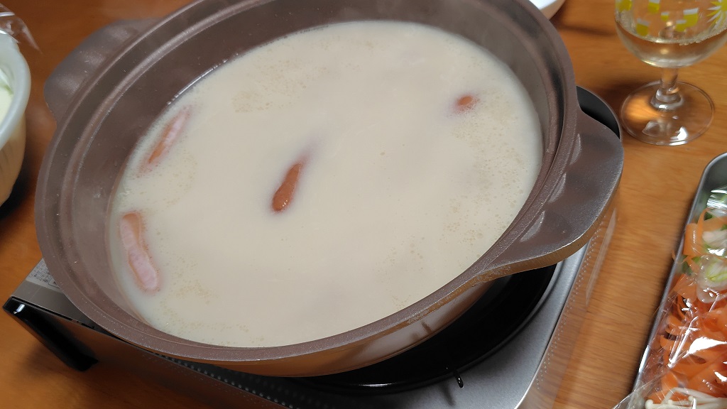 この鍋に、スガキヤのスープを2袋入れて、しゃぶしゃぶスタートです。
