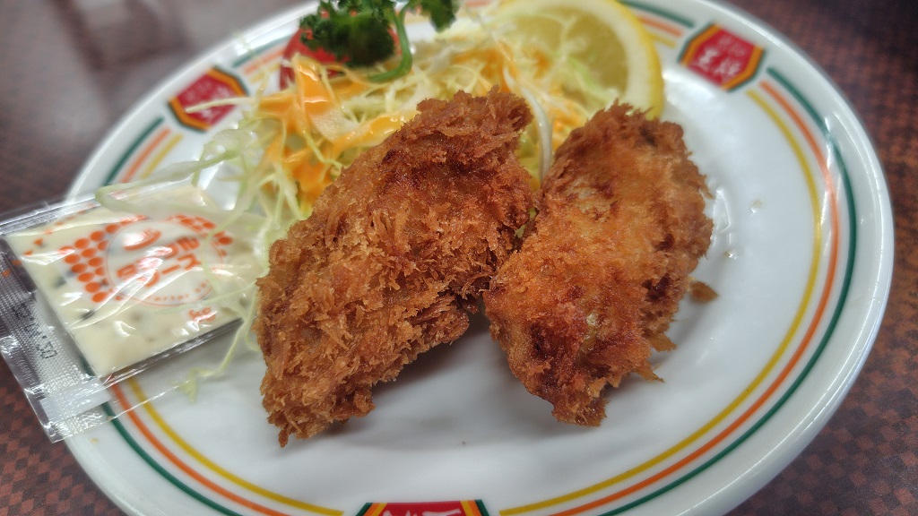 サイドメニューで、ジャストサイズでカキフライ2個。税込み363円。
