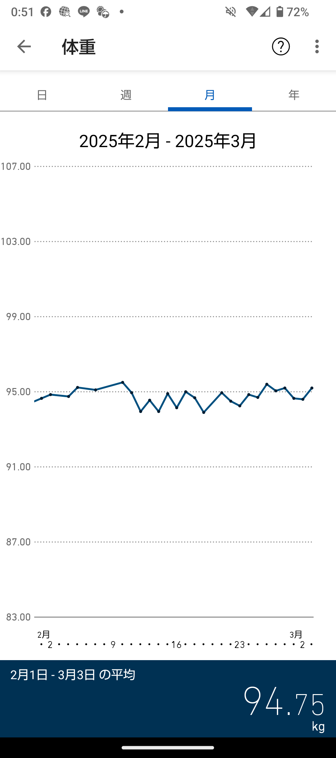 25年 2月 94.75キロ (前月比 マイナス 0.23キロ)