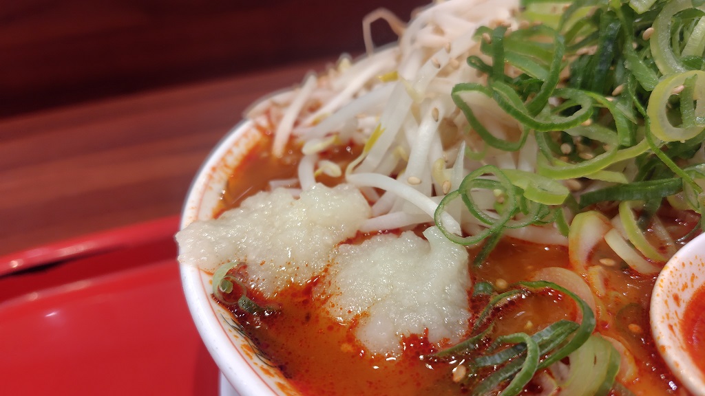 もやしの量が多いです。ネギも多いです。ネギは、ラーメン横綱と同じように、自由にトッピングできますが、最初からこの量でした。