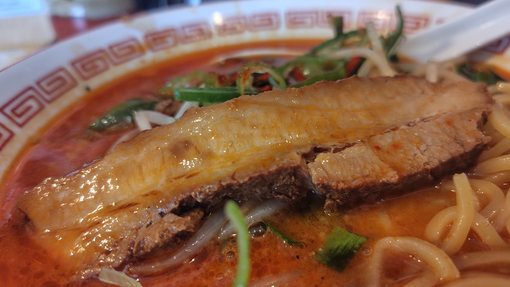 チャーシューは、豚バラ肉。丸めてありませんが、かなり分厚く切ってあります。普通のチャーシューの3枚分ぐらいのボリュームがありますね。
