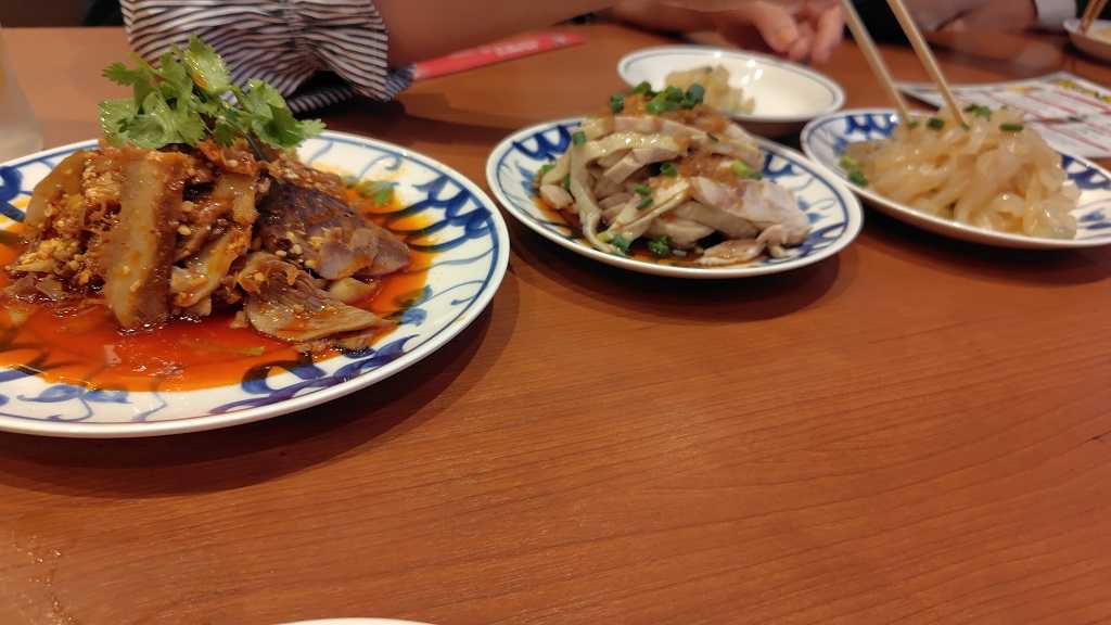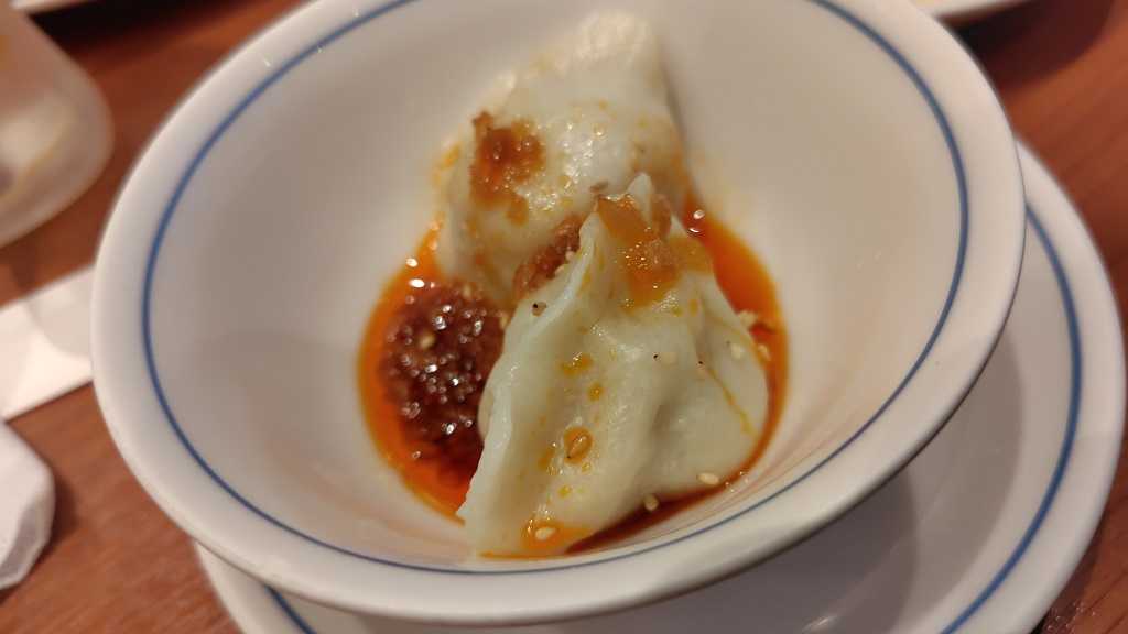 こちら、辛いラー油がかかった水餃子です。
