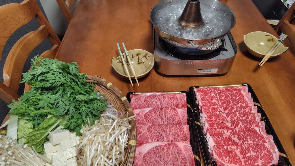 雨で冷えます。奥さんは土曜日も仕事なので、外食ではなく家でしゃぶしゃぶにしました。