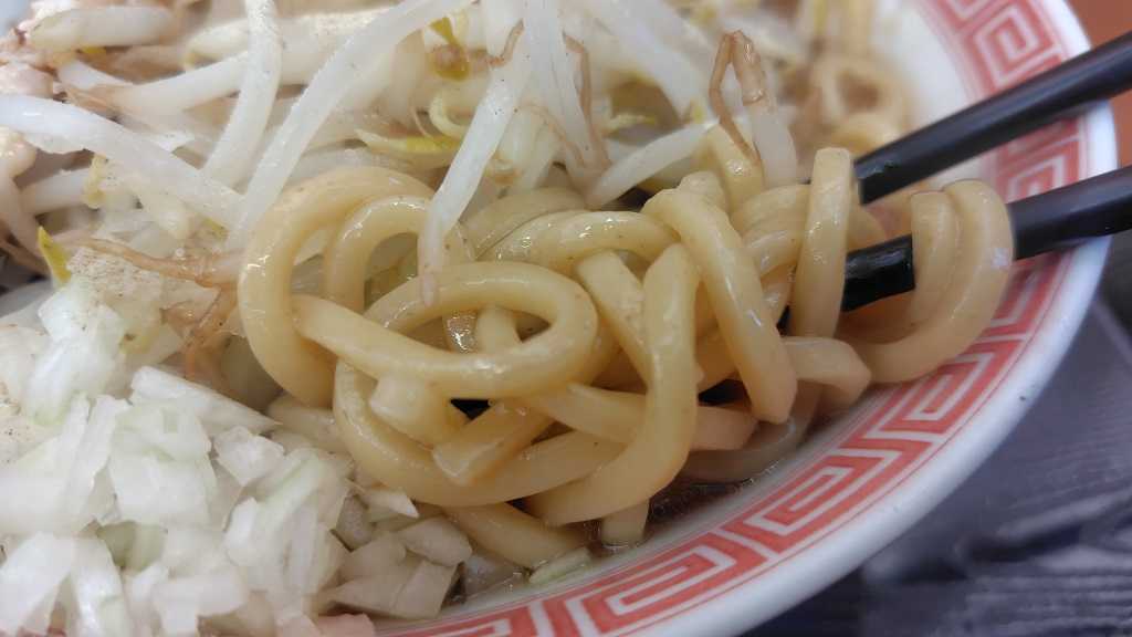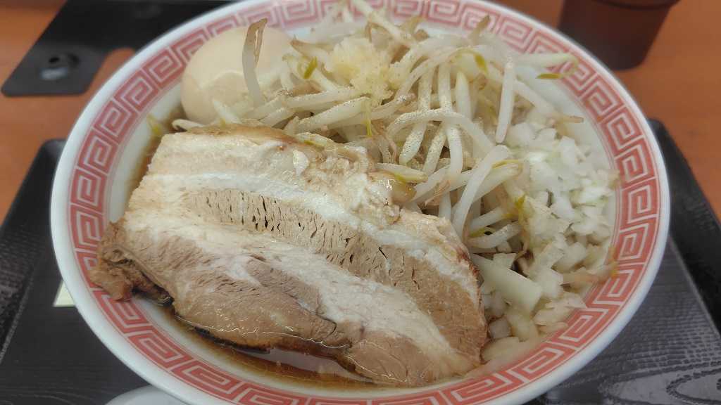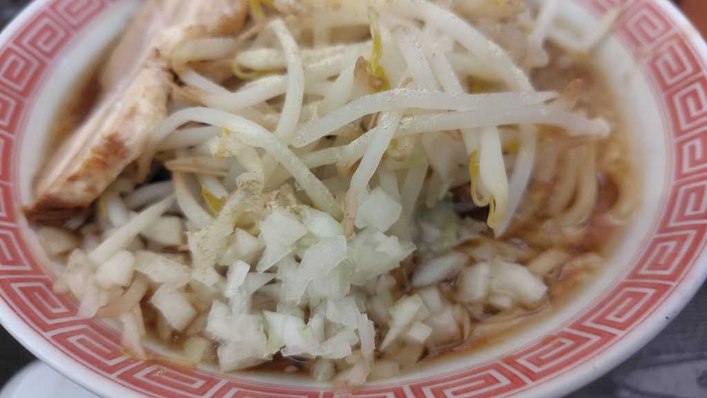 二郎系のラーメンかと思うのですが、なぜか横浜家系のような刻み玉ねぎがのってます。