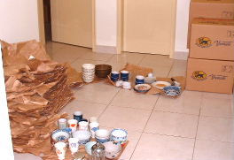 船便到着。60箱以上のダンボール箱と、その他の梱包物(子供の自転車、キーボード、ハンガーラック、鉄棒)が届いて、部屋の中は荷物だらけ。とりあえず、リビング、台所、寝室2部屋に分けて運んでもらったものの、やっぱり、必要度の高い、台所用品から開封することに。スペースがないので、廊下で作業。しかし、梱包材の多いこと多いこと。ダンボール箱1つの中身が皿10枚程度だったりする。頑丈な梱包のおかげで、ひとつも割れていなかったけれど、台所用品だけで、3時間近くかかった。午後は子供たちのおもちゃを開封。梱包材が山のようになったので、手間でも、シワを延ばして、畳むことに。さしゃとかおにも手伝ってもらった。帰宅したダンナくんが、「まぁ、のんびり開封すればいいんじゃない」と一言。‥手伝う気は、全くうかがえず、絶句。
