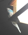 セキセイインコのそらちゃん。放鳥しても、なかなかカゴから離れようとせずに、じっと止まっているだけなので、ちょっと近づいてみた。バタバタバターっと飛んで、照明の縁に止まったそらちゃん。放鳥をし始めたころは、うまく着地が出来なくて、壁にぶつかったりしていたんだけど、だいぶ上手に飛べるようになったなーとうれしくなった。