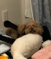 部屋の端っこに倒してあった、羊のショーンの置物にアゴ載せして、ぬいぐるみと化すメイちゃん。トリミング前だから、ボサボサなんだけど。