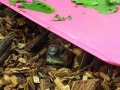 かえちゃんのレア写真。親バカじゃないけど、これ見た時は、「あらー、なんでこんな所にいるの?かえちゃんは~(ハート)」って感じになった。写真撮らねば!って思うよね。(ピンクの板は、エサ皿です)