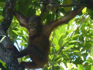 ホテルの裏がジャングルになっているので、山道を歩きながら、レンジャーさんが声をかけると、数匹、オラウータンの姿が。