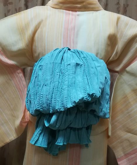 4回目の教室。半幅帯の貝の口(たれ付き)と、袋帯の練習をしました。今回は、教室での写真です。 貝の口(たれ付き)よくある貝の口の下にたれが出ているのわかるでしょうか?帯の上線は帯揚げで結んでしっかりと固定して、帯締めできっちり締めます。貝の口の応用編といった感じでしょうかねぇ~。帯結びはアレンジするのも面白いです。 絹何とか...絹のあとの名前忘れてしまいました (^_^;) 左は、Uさんに結んでもらったもので、右は私が結んだものです。慌てて撮ったのでピンボケしてしまいましたお太鼓の上のリボンが可愛いですね成人式などの振袖にぴったりです。あと、Uさんのリクエストで二重太鼓も結びました。習うより慣れろとはよく言いますが、わかっているのにいざ結ぼうとするとアレ?ってなるんですよね。本当に練習あるのみだと思います。とか言いつつ、家での復習はまだですなので、近いうちにぽてこさんで練習することにします。