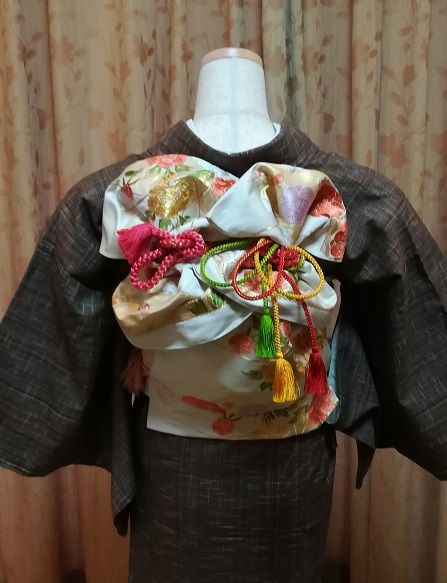 先日、今年度の着付け教室第1回目がありました。みやこ結びと、文庫、ふくら雀と袋帯の結び方を練習しました。家に帰って確認しようと、みやこ結びを検索したら半幅帯の結び方ばかり出てきてそういえば帯結びの名称なんて結構いい加減で、教室によって全く違ったり、結び方自体がオリジナルだったりするんですよね。まあ洋服と同じで、もともと日本人が日常に着ていたもの。個人のセンスや好みで好きに着るものですから、そもそもの正式名称なんて無いんでしょうね。検索で思うように出なかったのは困りましたが、せっかく教室で習ったので記憶を引き出しながらしっかり復習して覚えたいと思います。みやこ結び(たれを上にして結ぶ) 楽に着せつけたまま伊達締めも帯板もすっかり忘れて帯を結んだので、帯にしわが寄って不格好になってしまいました帯締めはクローバー結びキレイな四つ葉を作るのに苦労しましたが、初めての割にはうまくできたと思います。文庫(手先を上にして結ぶ) うーん、教室で結んだ時はもう少しうまく結べたんですが時間が経つとすぐに忘れてしまって、思うように結べません練習あるのみなんですかねぇ~。帯締めと帯揚げで遊んでみましたふくら雀(たれを上にして結ぶ) 帯が短いのか、始めの結びの配分が悪かったのか、お太鼓を作るのにぎりぎりの長さしかなく形を整えるのも難しかったです。帯揚げはまたまたリボン結びです