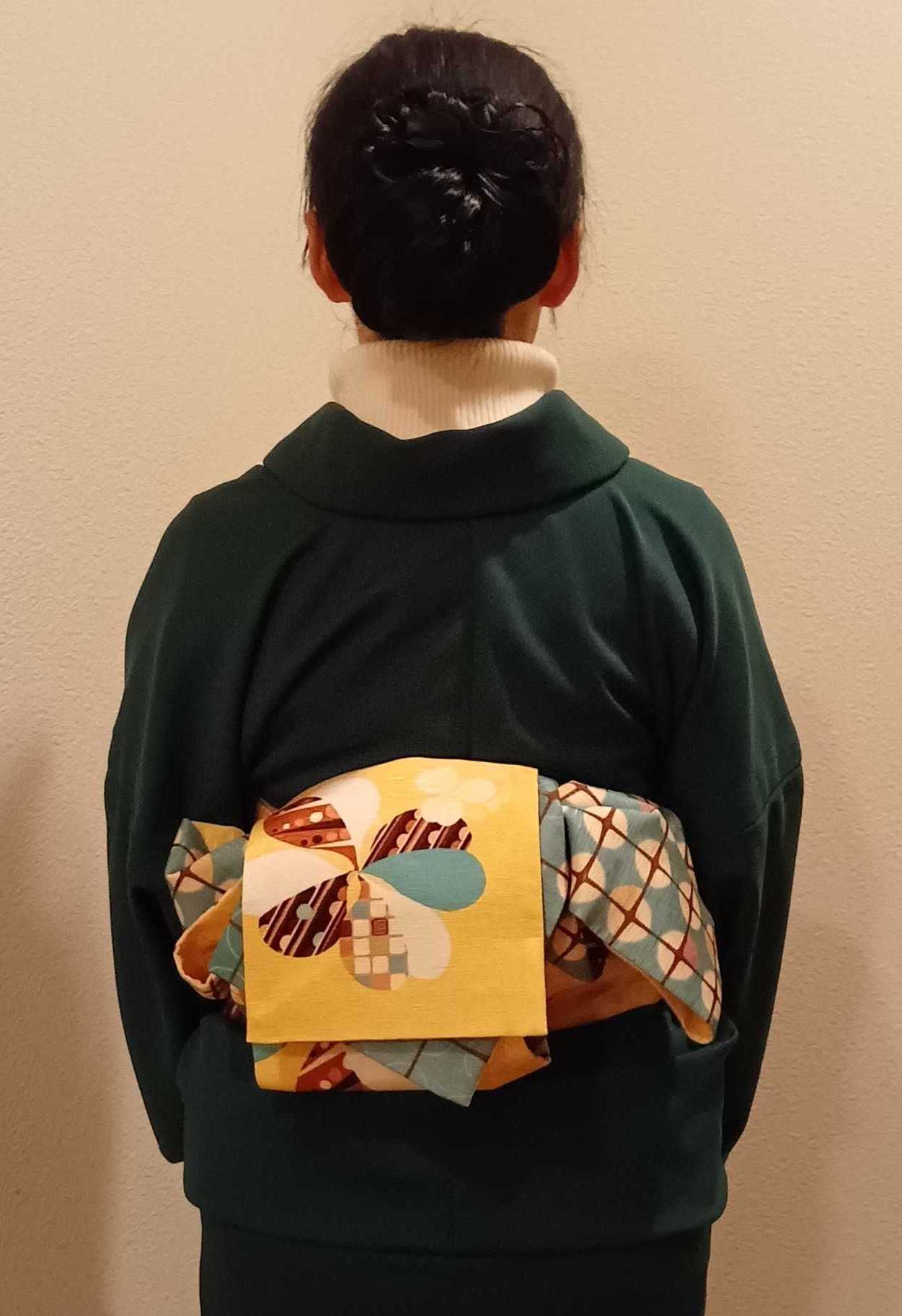 3月、まだまだ肌寒い季節だけど春を感じたくてクローバーの帯タートルネックセータージャージ着物春らしくクローバーの半幅帯