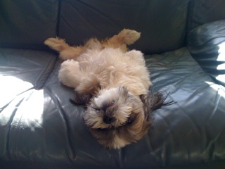 いつも一番寝心地が良くて、寒い日は暖かいところ、暑い日は涼しいことろを選ぶショーンですが、少し肌寒い昨日の朝も、やはりソファーの上にあった肌がけに潜り込むようにして寝てました。携帯のカメラをそーっと向けたのに、気づかれちゃった。私がシーズー犬を飼い始めたのは34年も前、初めて家にやってきたパフとは16年、次は去年天国へ旅立ったサンディーと17年、そしてショーンと現在14年、ずっとシーズー犬と一緒の毎日です。だからワンコの気持ちよくわかります。