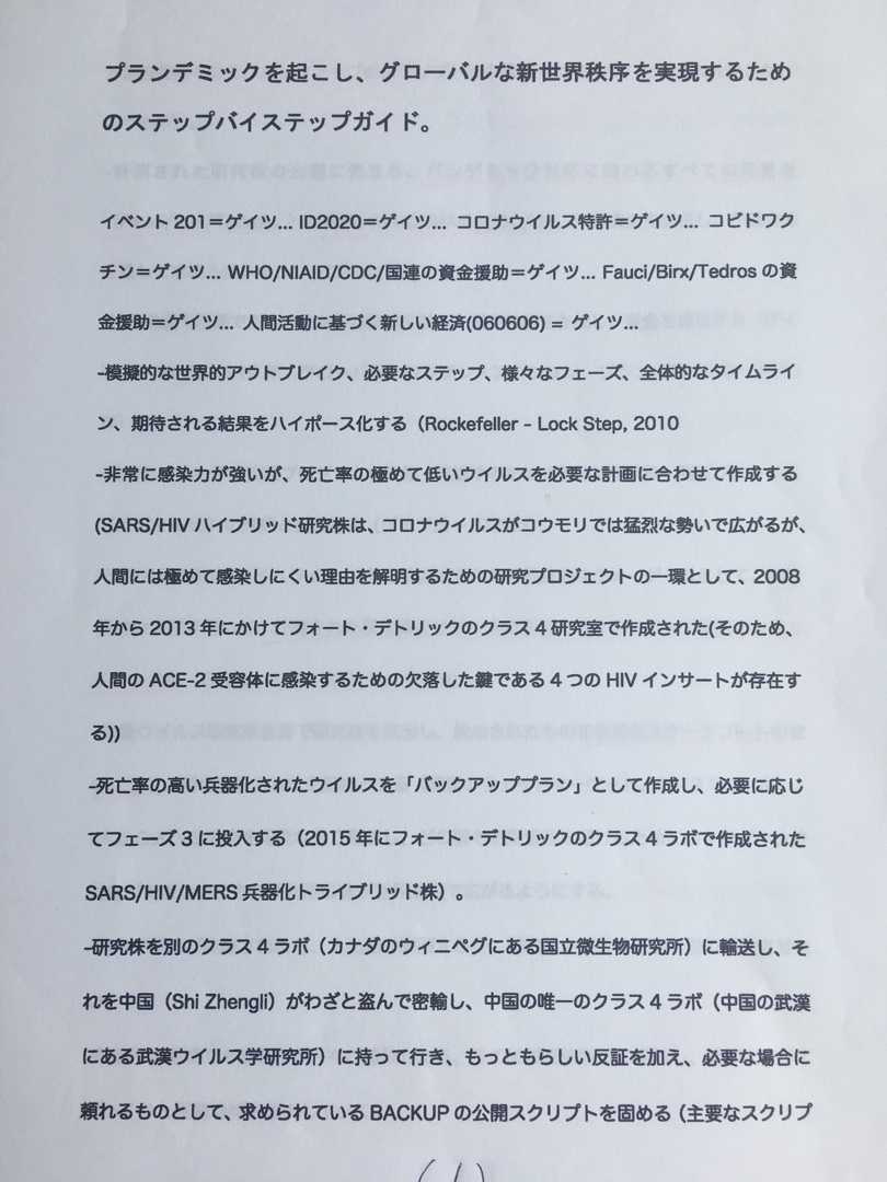 一年前ネット上に出た情報のようですが、昨日見つけて衝撃を受けたので、今日はそのことについて書きます。現在進行中のプランデミックを説明するものとしてかなり詳しく書かれています。驚くべきことに、ここに書かれているのは私たちが去年から経験してきた、まさにパンデミックそのものだからです。