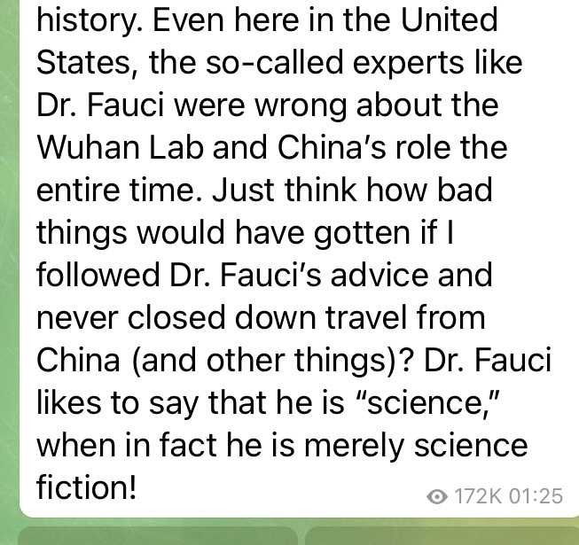 ここアメリカの所謂ドクターファウチのような専門家は武漢研究所と中国の役割について間違っていた。もし私がドクターファウチのアドバイスに従って中国からの旅行者を受け入れていたら(他のことも含めて)、状況はもっと悪い方向に行っていただろう。ドクターファウチは自分をサイエンスと言うが、実際彼自身はただのサイエンス フィクションだ!