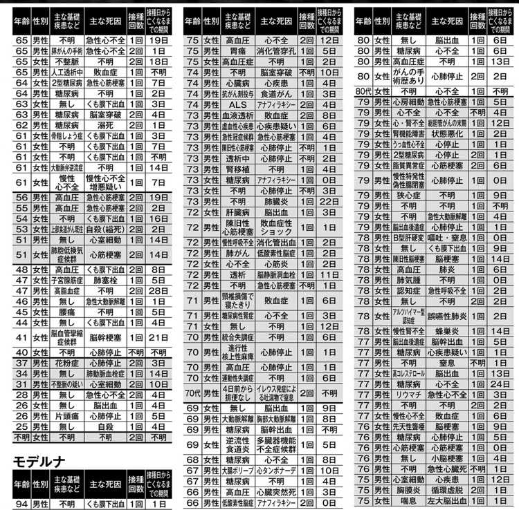 は死亡した人から順にリストに表示していましたが、女性セブンのリストは年齢順になって3ぺージありました。このリストの画像は3ページ目です。6月の中旬までのデータですので最後の一人(モデルナ社)を除いて全てファイザー社コミナティーを打った方々です。