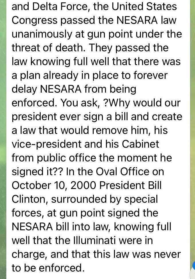 彼らは、NESARAの施行を永久に遅らせるという計画が既にあるのを知りながらその法を通したのです。では何故大統領が彼自身も、副大統領も、内閣も、署名をした瞬間から公の座を降りることになる法に署名をしたのかって? 2000年10月10日、クリントン大統領は特殊部隊に取り囲まれ銃を向けられた状態で署名をしたのですが、イルミナティが裏にいてその法が実施されることが決してないことを知っていたのです。