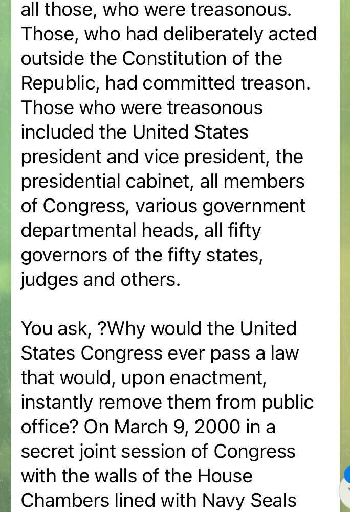 何故って? では何故法の成立に伴って彼らが即座に公の場から離れなければならないような法を通すことができたのでしょう? 2000年3月9日、秘密の上院、下院ジョイントセッションが行われ、議院の壁に並ぶNavy Seals(ネイビーシールズ)とDelta Force(デルタフォース)に銃で脅される中、NESARA法を全員一致で通したのです。