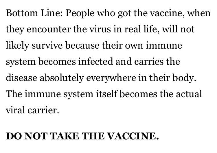 結論:ワクチン接種を受けた人々が普段の生活でウィルスに遭遇した時、彼らの免疫システムが感染し彼らの体の隅々まで病気を届けるので、彼らは生存することができないでしょう。