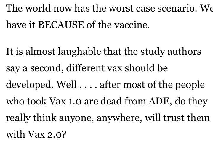研究者たちが2番目の違う種類のワクチン開発が必要だというのを聞くと、もう笑い話です。 それは…Vax1.0を受けた殆どの人々がADEで亡くなった後に、彼らはどこかで誰かがVax2.0を信用するとでも思っているのでしょうか?