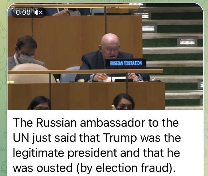 UNの国連大使が、トランプが合法的な大統領だが選挙不正で追放された、と言った。