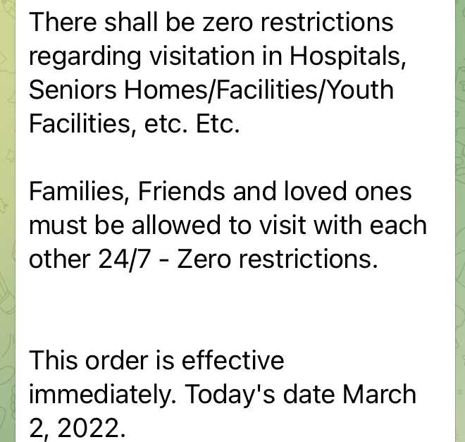 3月2日をもって、全ての高齢者施設や病院(民間、公を含め)は、家族、親戚、友人、愛する人々が自由に、入所者を訪問できるようにすること。