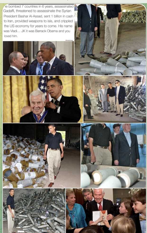 (左上)...ガダフィを暗殺、シリアの大統領、バシャーアサドを殺すと脅し、10億ドルの現金をイランに送り、ISISに武器を提供し、後のアメリカの経済をメチャクチャにした。その人物はあなた方が愛したバラク オバマだった。