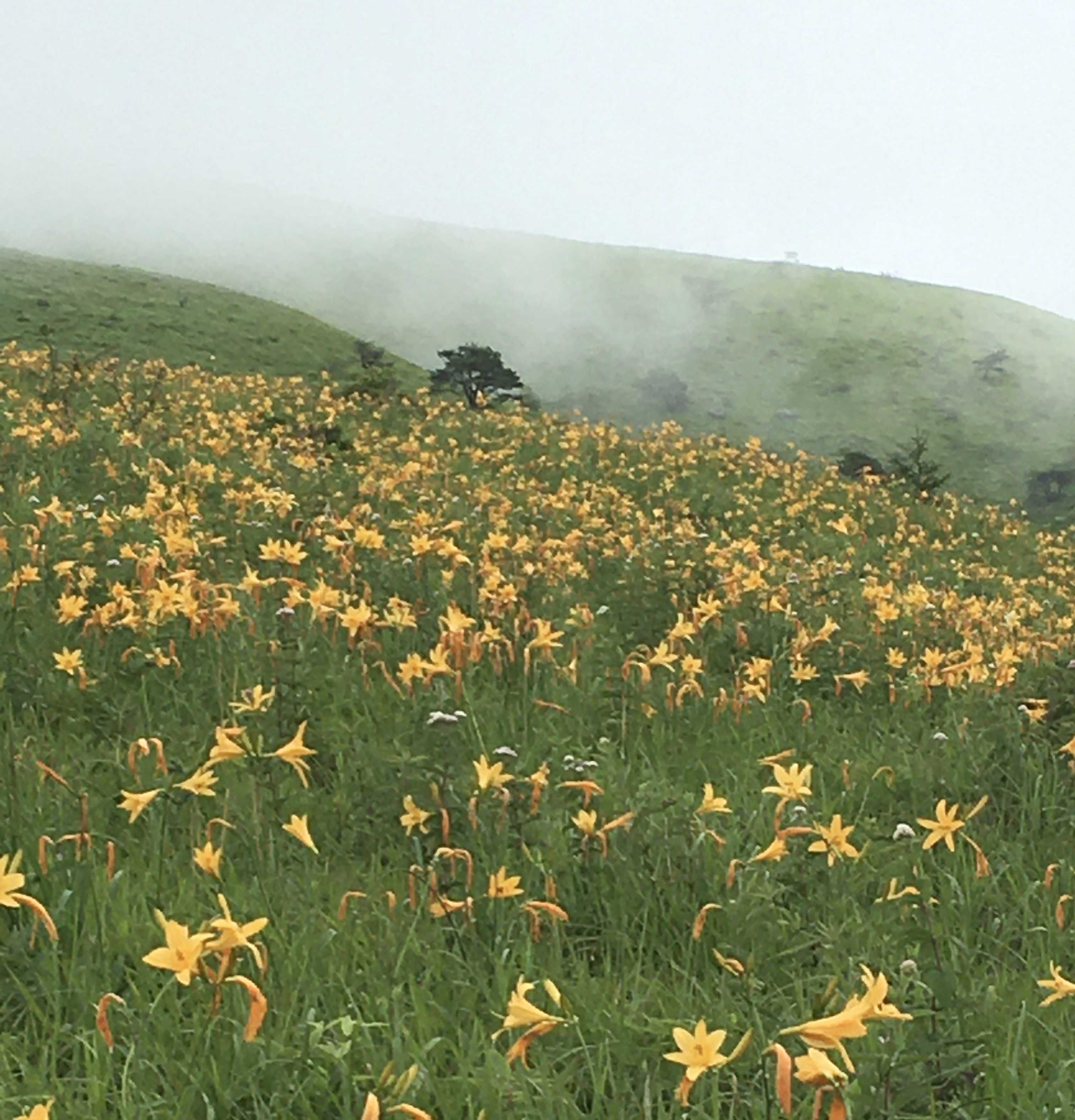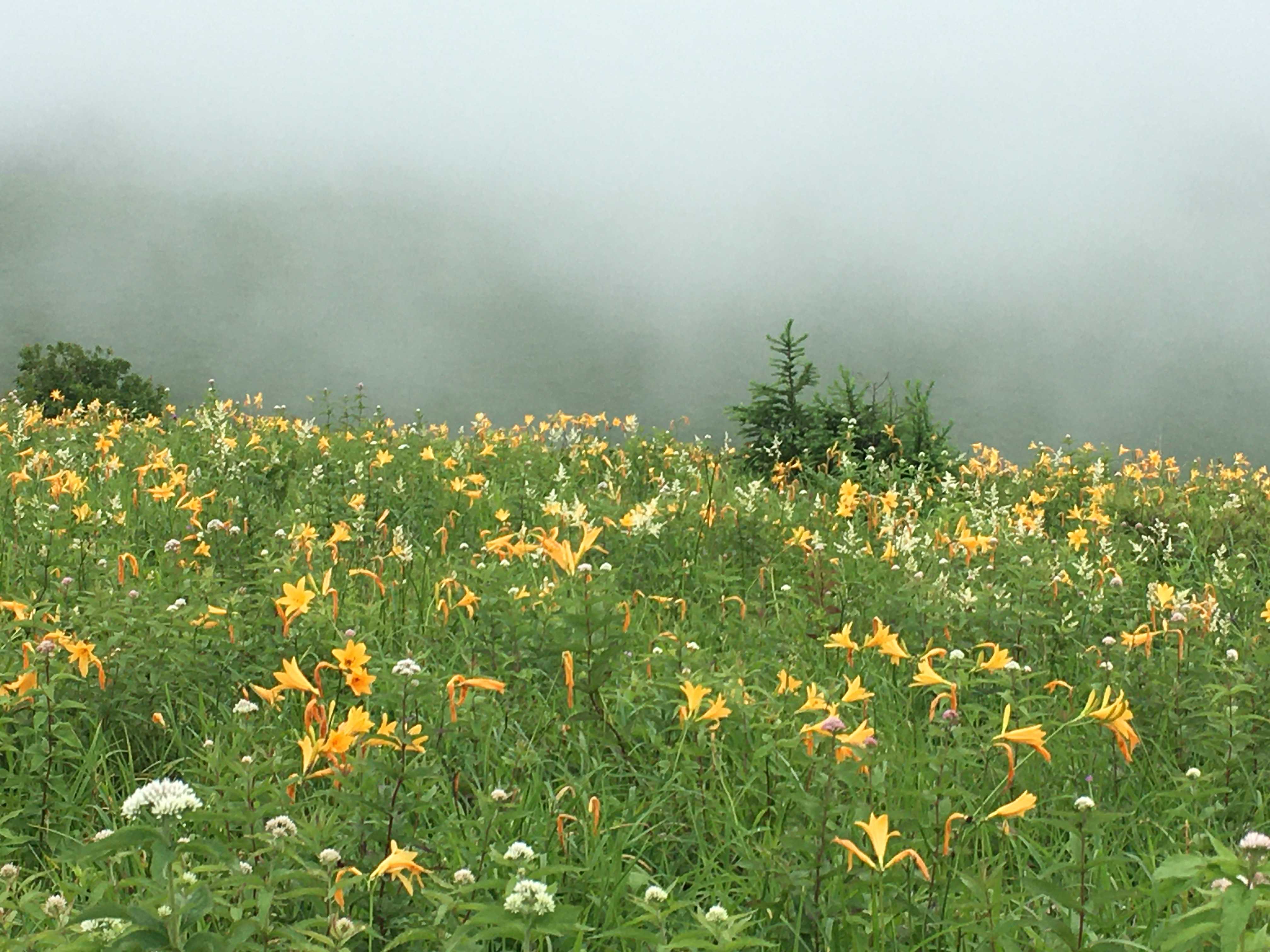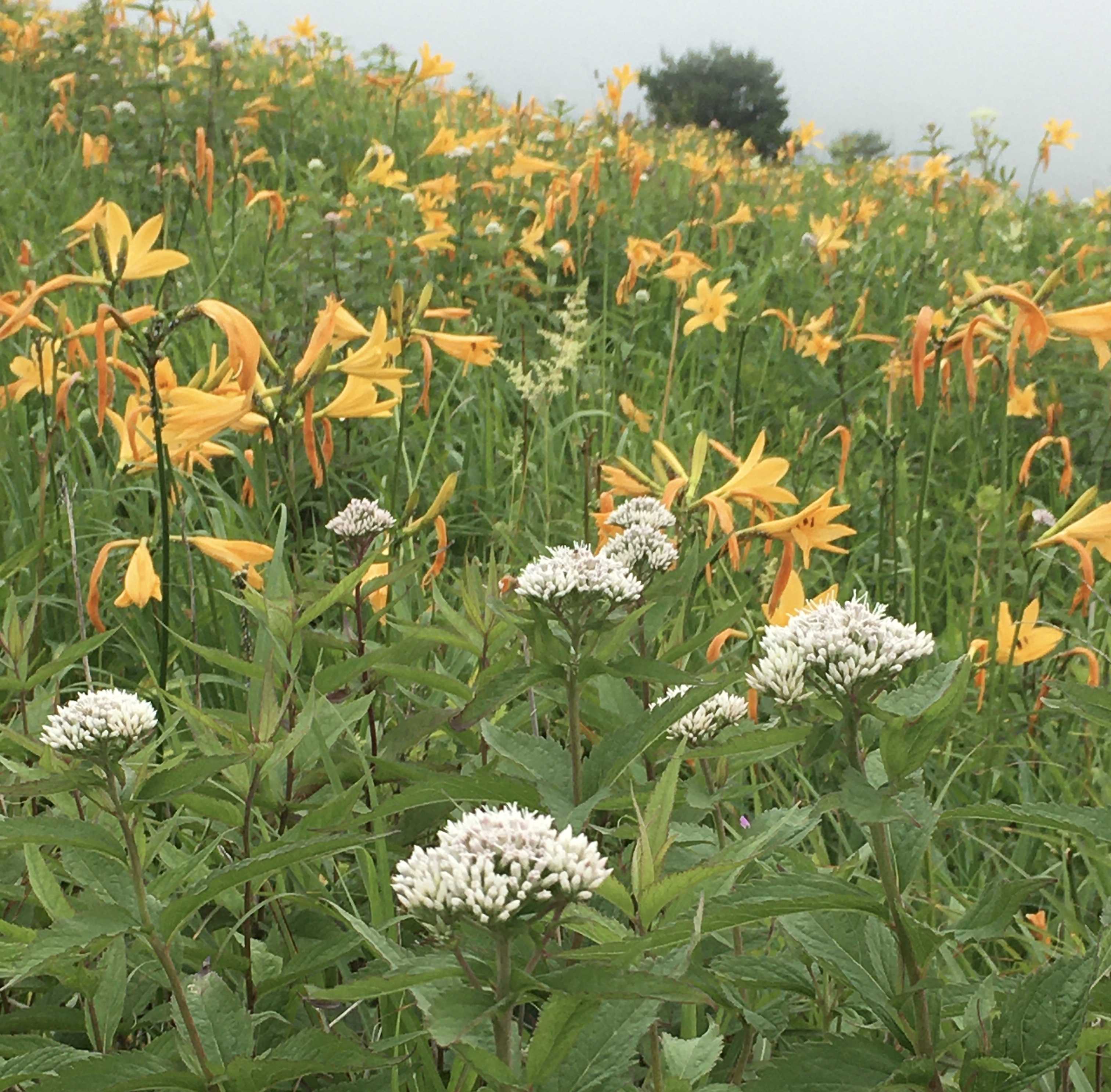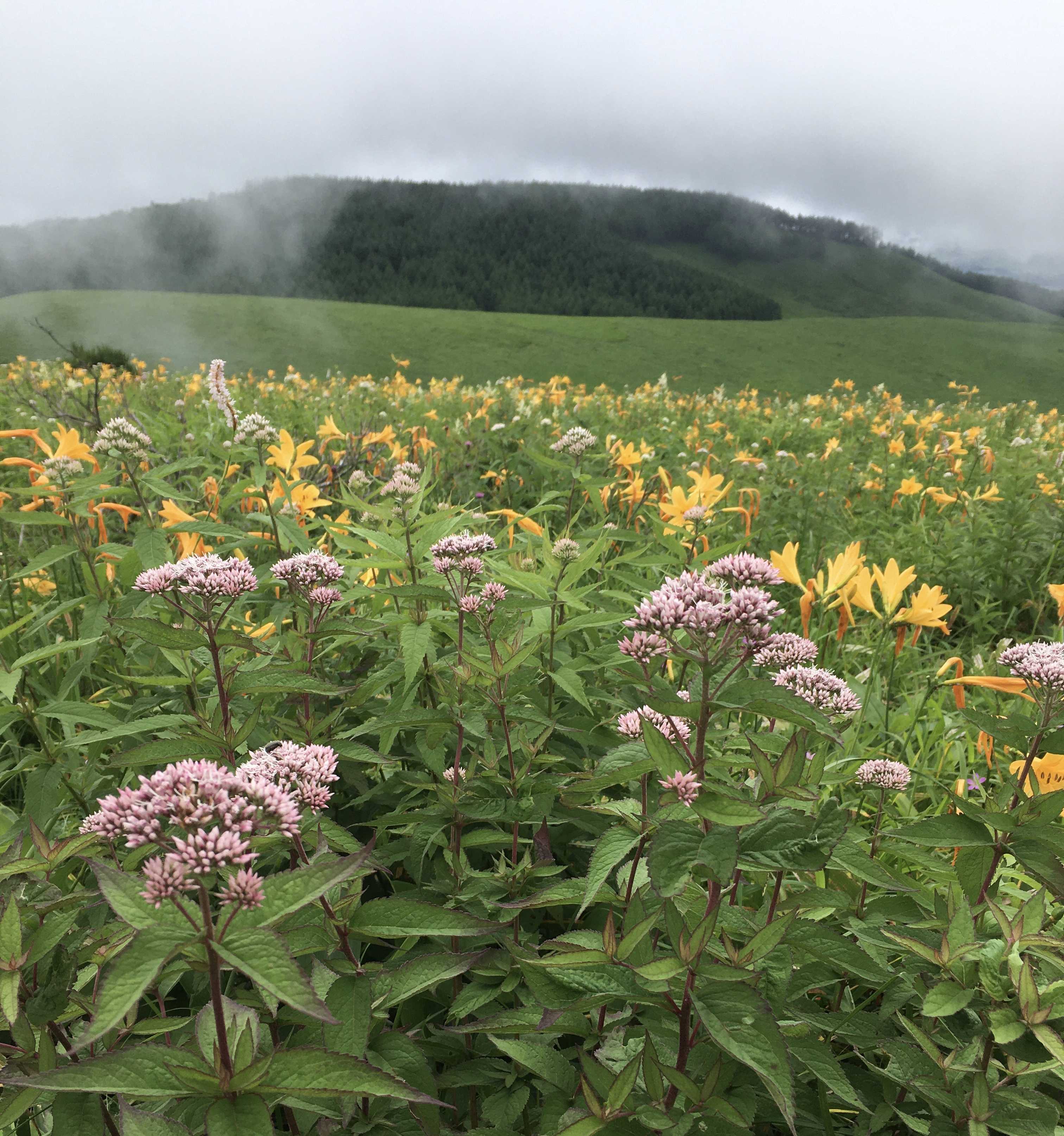 ちょうど雲や霧が出てお日様が隠れてしまいましたが、ニッコウキスゲは例年になくたくさん咲いていましたし、イブキトラノオやハクサンフウロなど、他の花たちも元気に咲いていました。