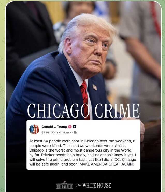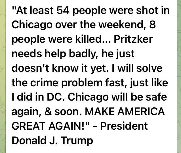 ”先週末シカゴで少なくとも54人が撃たれ、8人が亡くなった... Pritzkerは重傷だ、彼にも分からない。私は犯罪の問題を一刻も早く解決するつもりだ。ちょうど私がワシントンD.C.で行ったように、シカゴももうすぐ安全な都市になるだろう。アメリカを再び偉大に” ー 大統領ドナルド J. トランプ