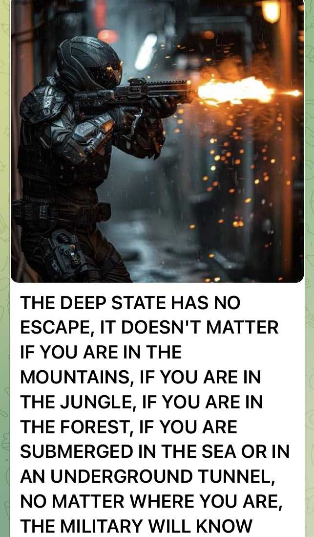 ディープステートお前たちは逃げられない。たとえ山の中であろうと、ジャングルの中であろうと、森の中であろうと、海の底であろうと地下トンネルであろうと、どこに隠れようと軍が見つけ出すだろう。
