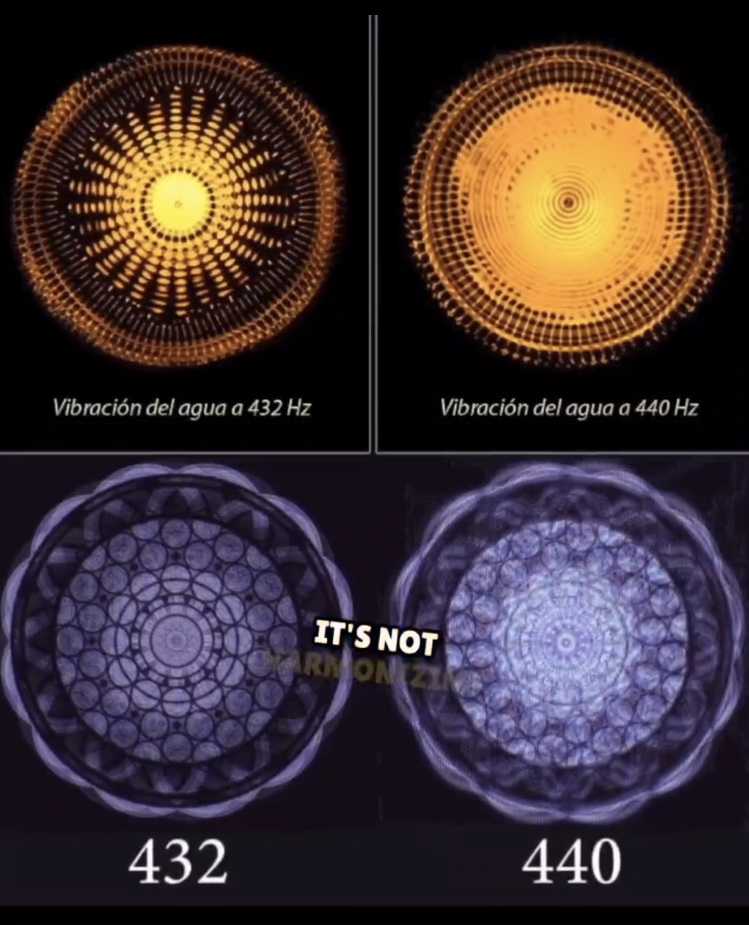 この画像👆は一人の男性の周波数に関する動画からスクショしたものです。男性曰く、私たちは音楽が440Hzに変えられた以前、つまり432Hzを持つ基音で録音された音楽を聴くべきだと主張しています。