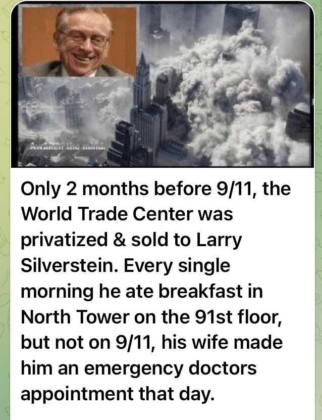 9/11が起きたほんの2ヶ月前、ワールドトレードセンターは、民営化されラリー・シルバースタインに売られた。毎朝彼はノースタワーの91階で朝食をとっていたが、9/11は彼の妻が緊急でドクターアポイントメントを取った。