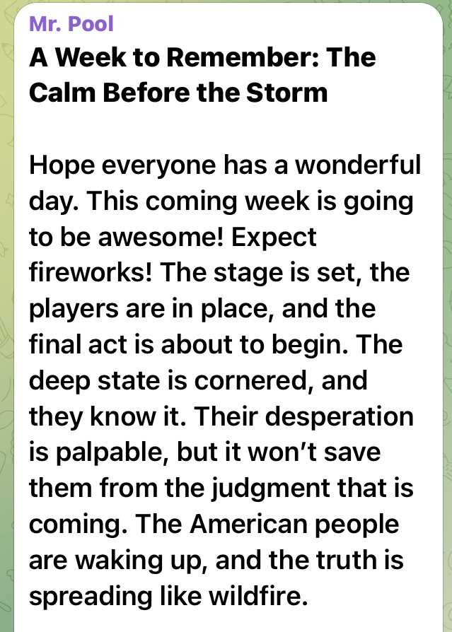 皆さん、素晴らしい一日をお過ごしください。今週は素晴らしいことが起こります!花火に期待してください!舞台は整い、出演者は揃い、最後の幕が上がろうとしています。ディープステートは追い詰められており、それを自覚しています。彼らの必死さは明らかですが、それが来るべき裁きから彼らを救うことはありません。アメリカ国民は目覚め、真実は火のように広がっています。